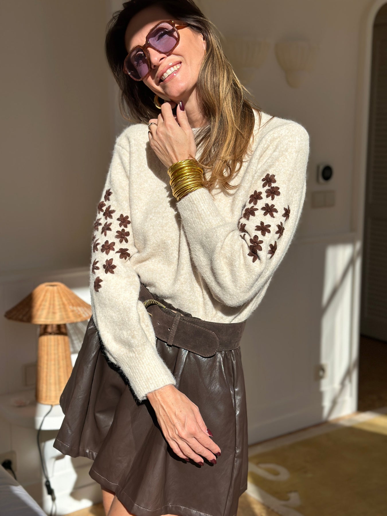 The Théoxane Knit blends cozy comfort with refined detail — featuring delicately puffed sleeves adorned with tone-on-tone floral embroidery that brings a subtle romantic charm to every outfit.